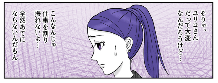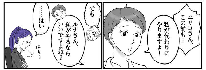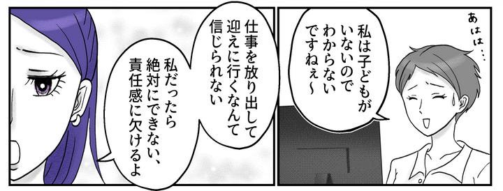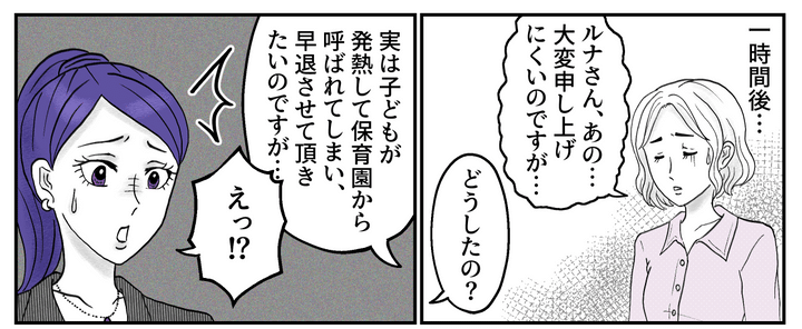 結局、他のメンバーが仕事を引き受けることになり、ユリコさんはすぐに職場を後にしました。人に仕事を押し付けてさっさと帰るなんて……。私にはどうしても、子育てが仕事から逃れるための言い訳のように思えてしまうのでした。