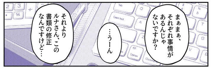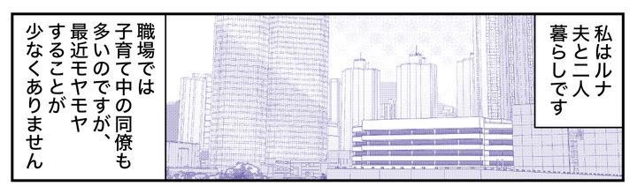 私はルナ。夫のヨウスケと暮らしています。夫婦間でよく話し合い、子どもはもたない選択をしました。最近私は職場で、チーム内に仕事を割り振るリーダー的なポジションにつきました。任されたからには、責任感をもって業務を遂行したいです。けれど、思うように物事が進まず、モヤモヤすることもあります。とくに子育て中のメンバーは頼りにならないと感じてしまいます。「子育て」を仕事をしたくない言い訳に使っているのではないかと、つい疑ってしまいます。