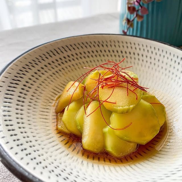 花蕾と茹でて食べる方が多いと思いますが、生のままスライスして漬物にするのが絶品なんだとか。中華風の味付けなのでビールがすすみそうです♪