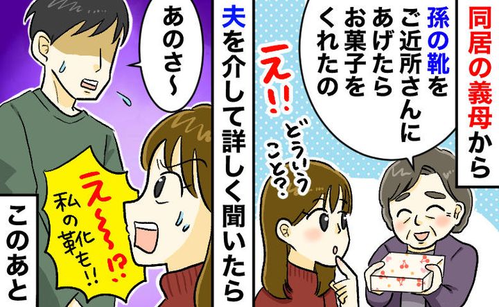 義母「孫の靴をあげたらお菓子をもらったの」私「え…!?」夫経由で判明した“ドン引きの真相”とは?