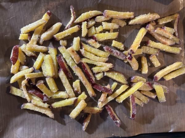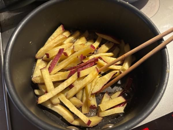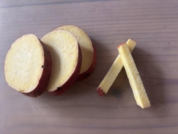 ・掘りたてのさつまいもは、甘くないので、1~2週間干してから使いましょう!ほどよく水分が抜けて甘味が増します。 ・さつまいもを切る時に、太めにきるとほくほく、細目にきるとカリカリ感が強くなります。お好みの幅で切ってくださいね。