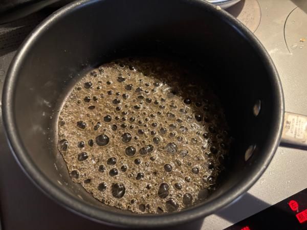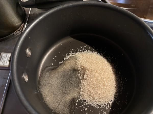 4.鍋に、砂糖・水を加えて混ぜながら加熱する(わざと糖化させてざらざらに仕上げる)。