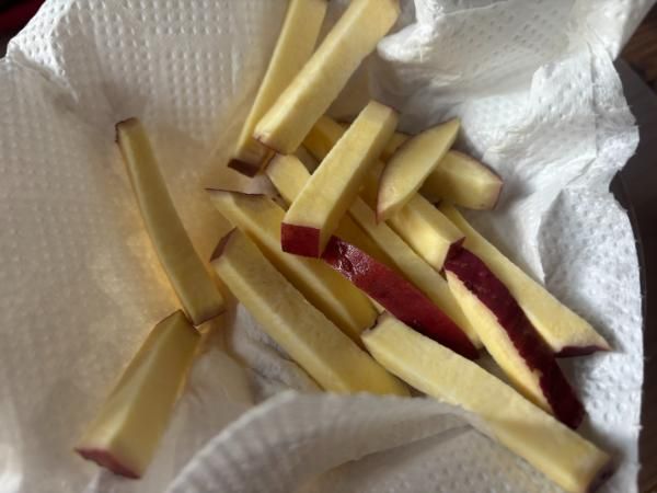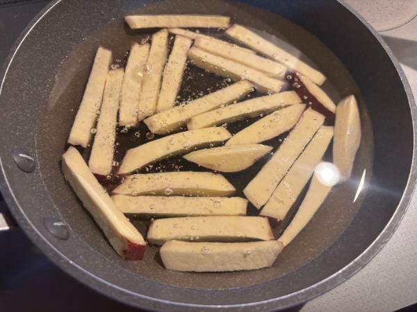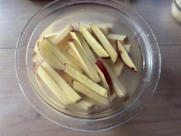 <作りかた> 1.さつまいもを7mm程度の輪切りにして、それを同じ幅(7mm)ぐらいの棒状に切り、水にさらす。