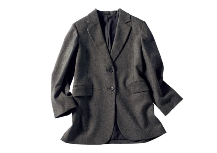 生地の織りによるグレー調のブラックがシック。ゆとりのあるシルエット。ジャケット¥27,000/PLST