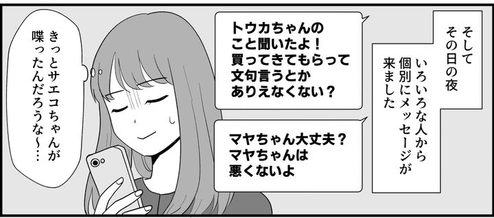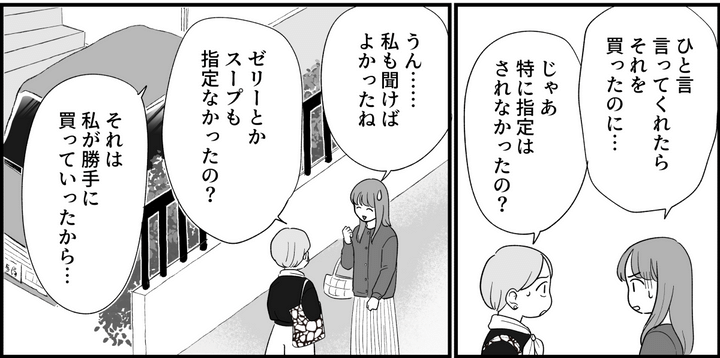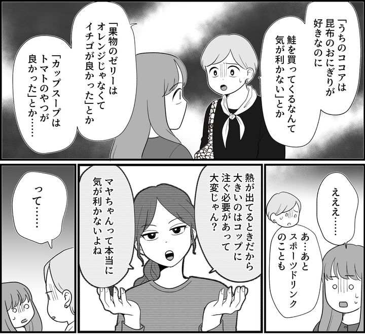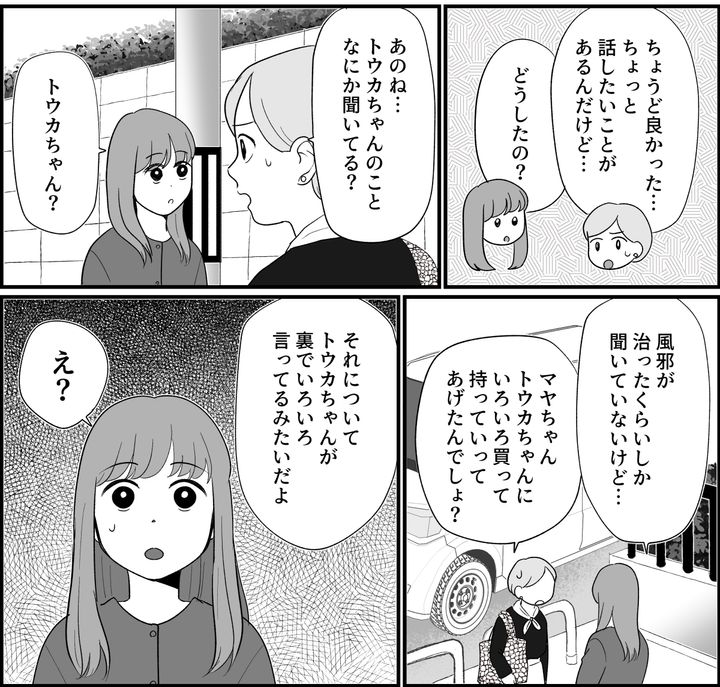 それから少し経って、ママ友のサエコちゃんにバッタリ会いました。そしてサエコちゃんは、少し言いづらそうに私に話を始めました。なんとトウカちゃんは発熱したときに私が持っていった「差し入れ」のことで……私のことを裏で悪く言っているというのです。