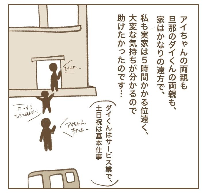 ワンオペのアイちゃんのために上の子のお迎えをしてあげてさらに預かってあげることに。活発な子なので外食し遊具施設へ。つわりは辛いものだし、助けてあげたい気持ちはわかりますが、かなりお金と時間がかかってしまいますね。しかしなんとこの生活が半年も続いたと言うのです!!