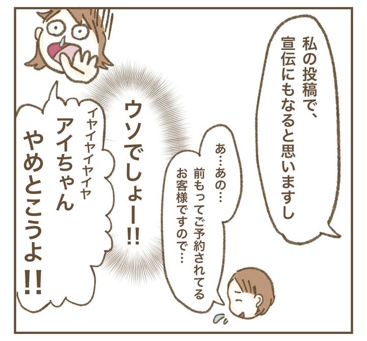 すると、どうしても通された席の光の具合や背景が良くないと席を変えてほしいとアイちゃんは店員さんに変更を要求。しかしアイちゃんが交換してほしいと言った席にはすでに他のお客さんが座っています。それでも「私の投稿で宣伝になる」と言うのです。