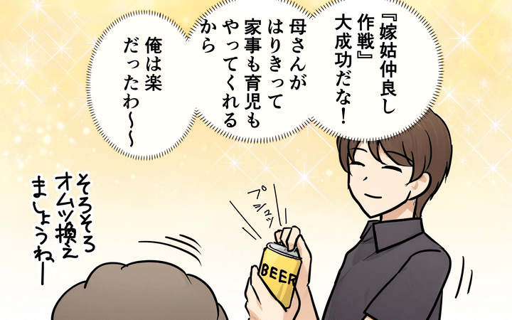 俺の目論見通り「嫁姑仲良し作戦」は大成功でした。ふたりの距離は確実に縮まったうえに、母さんが家事育児を張り切ってやってくれるので、俺は楽に過ごせます。でも、それを見た妻は「子どもの面倒を任せっきりにするな」と不満そうで…。せっかく母さんが来てくれてるんだから、どんどん頼ればいいと思うんですけどね。