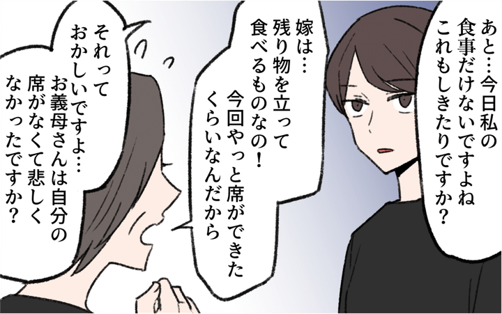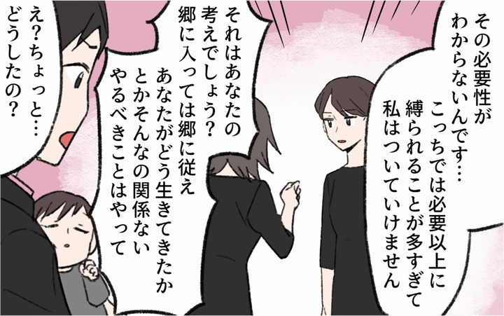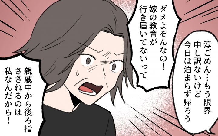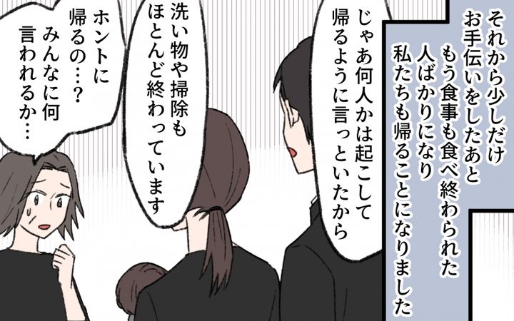葵の義母は古い男尊女卑に囚われている人。夫もわかっているので、妊娠出産も極力義実家との付き合いを避けてくれた。初節句だけは義実家でしてほしいと義母に迫られるが、雛人形にクレームを入れられ、結局行かないことに。今度は法事の手伝いに行くことになる葵だが、義母や親戚からの扱いがひどく、ついに言い返す。