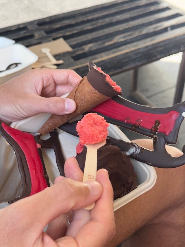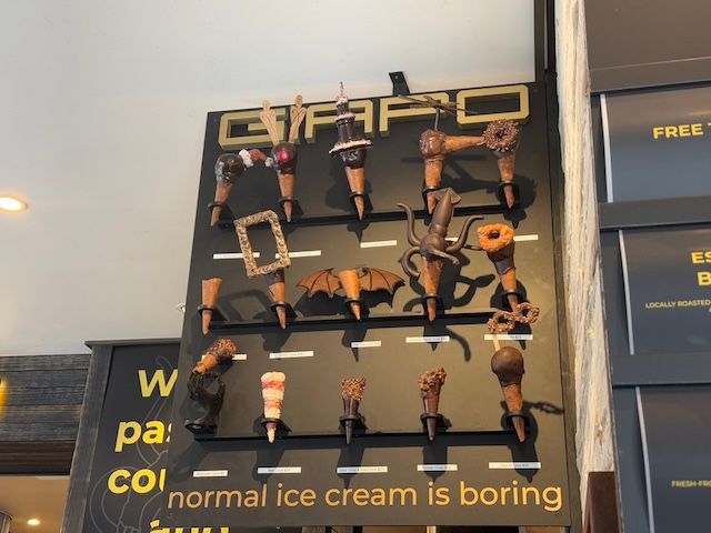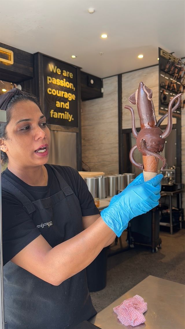 彼らは、アイスを単なる“冷たいおやつ”ではなく、芸術作品のように五感で楽しむものとして再定義。そのため、店内のキッチンでは、チョコレートの彫刻やユニークなコーンを職人たちが丁寧に手作業で仕上げています。スタッフ全員が「アイスアーティスト」として、味だけでなくストーリーまで提供しているのです。