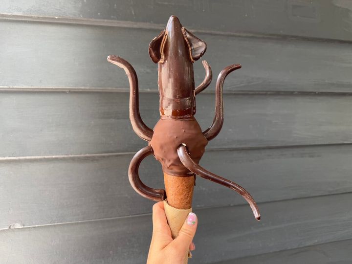 Giapoのショーケースには、いわゆる“丸いアイスの球”は並びません。最も有名なのは、チョコレートで作られた巨大なイカの形のアイス。ニュージーランドの海を象徴するシンボルを、まるで彫刻のように表現しています。