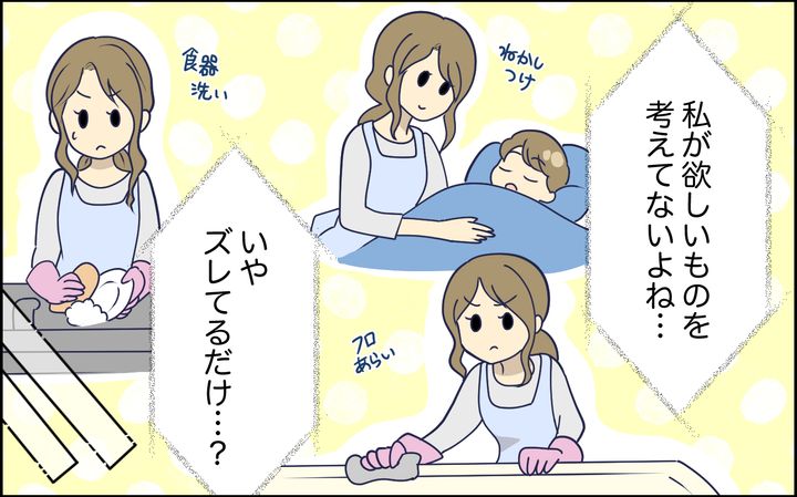 私を喜ばせたいと思ってくれる夫の優しさは伝わってくるけれど、その間も私は家事育児にてんてこまい。プレゼントよりももっと察してくれたらいいのに…。