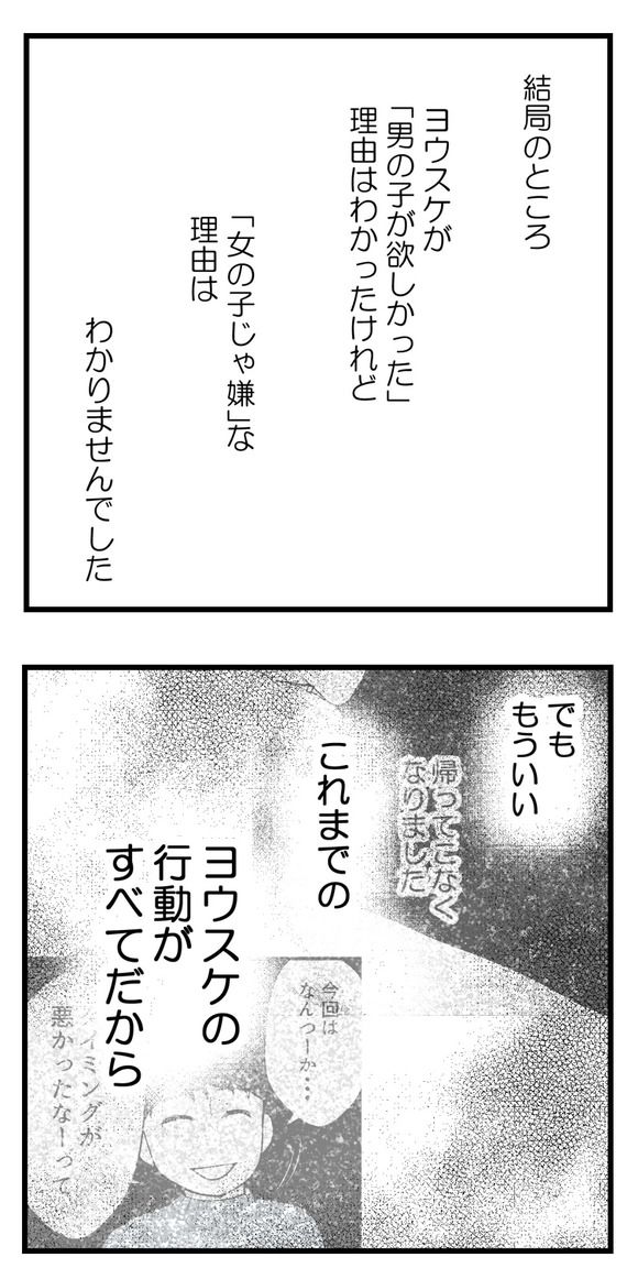 ヨウスケと離婚の手続きをして別れる際、最後にユウは子どもの性別を決めるのは男性因子だと告げました。その上で、「そんなに男の子が欲しいなら、次は自力でなんとかしたらいいよ」と言い放つのでした。