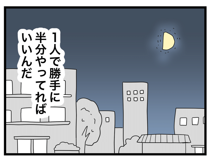 妊娠を機に結婚した主人公・マチ子。夫・ブン太は何でも半分にしたい性格で、寝込むほど辛いつわりの時期を迎えたマチ子にも、家事や生活費の支払いを執拗に強要します。産後、マチ子はブン太と元同僚のミナミが裏切りの関係にあることを突き止め、ブン太に離婚を言い渡しました。離婚に応じると嘘をつき、マチ子との面会を取り付けたブン太は、自分が半分にこだわるようになった経緯を話し、マチ子でなければダメだと改めてプロポーズしました。しかし、マチ子は裏切られたこと、そして面会中にブン太が娘の話を一切しないことから、ブン太が自分たちを愛していないことを確信。泥沼でも争い続けると伝えてその場を後にしました。その後もしばらく離婚を拒否していたブン太でしたが、ようやく離婚届に判を押し、無事に離婚が成立しました。慰謝料は「半分じゃないと気持ち悪いから」と、きっちり財産の半分をマチ子に渡しました。数年経った今でも、ミナミからは慰謝料、ブン太からは養育費が毎月振り込まれており、マチ子自身も働いているので生活には不自由していません。しかし、ふと思い出すと涙が溢れて出て…。