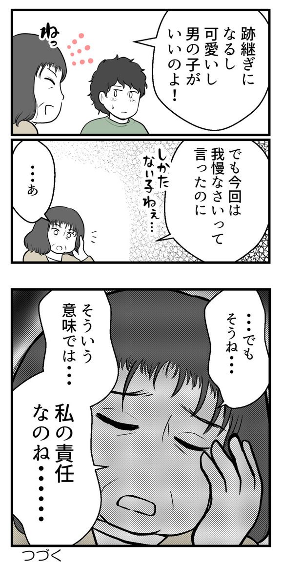 夫のヨウスケに「どうしても子どもが欲しい」と言われ、子どもが苦手なのに承諾したユウはやがて妊娠。夫婦で喜ぶが、女の子だと発覚するとヨウスケの様子がおかしくなってしまう。ユウと接するのを避け、家にも帰らなくなってしまったのだ。出産後は一度、性別を確認するだけのためにヨウスケはやってきて、女の子と知り早々に帰った。ヨウスケのことはあきらめ実家での子育てをスタートしたユウ。しかし、きちんとこれからのことを話し合うべく、産後4ヶ月頃に自宅に戻る。すると義母もいて、ユウの母も含めて4人で机を囲むのだった。話し合いでは、義母から「ヨウスケは離婚したいって言ってますから」と言われ、ユウは「ヨウスケの口から聞いたい」と返します。すると「女なんて想定してなかった」と打ち明け、子どもが欲しいと言い出したのも義母に催促されたからだと発覚し…!?