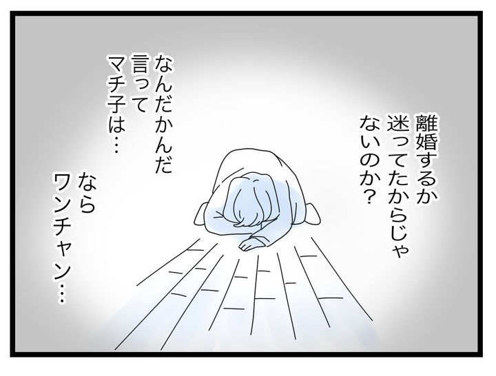 同棲中に子どもを授かり、ブン太と入籍した主人公・マチ子。しかし、ブン太が生活費も家事も完全に折半したいという強いこだわりを持っているため、つわりで苦しむマチ子は辛い日々を送っていました。心身ともに限界を迎えたマチ子は一度は離婚を考えますが、出産後に育児に積極的なブン太を見て、離婚を考え直します。しかし、そのタイミングで、ブン太が元同僚のミナミと関係を持っていることが判明します。ミナミにその事実を突きつけると、彼女はブン太との関係を認め、慰謝料の請求に応じることを約束し、ブン太とのメッセージ履歴をマチ子に渡しました。ある日、ブン太の誕生日を盛大に祝ったマチ子は、その翌日、離婚届を置いて娘を連れて家を出て行きました。すぐに電話をかけてきたブン太は、「離婚はしない」と一点張りです。これまでうまくやってきたと本気で思っているブン太は、「仕事が辛いなら専業主婦に戻って、家事を半分ずつ続けよう」と提案します。しかし、マチ子は半分ずつ分担することが不満だと訴えますが、ブン太は離婚に至る理由としては納得がいかない様子です。そんなブン太に対し、マチ子はついにミナミとの裏切りを突きつけるのでした。