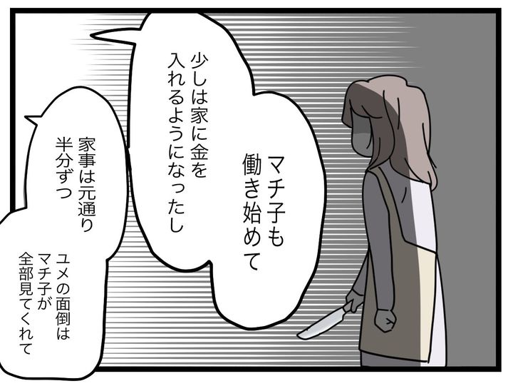 主人公・マチ子は、妊娠をきっかけに夫・ブン太と結婚します。生活の負担を半分ずつにしたいというブン太のこだわりは日々エスカレートし、つわりで辛い思いをするマチ子を苦しめます。出産後、育児に積極的になり、半分にうるさくなくなったブン太でしたが、元同僚のミナミとの裏切りの関係が発覚します。しっかりと準備を整えたマチ子は、ミナミとの直接対決に臨みます。逆ギレするミナミを確固たる証拠で言い負かし、家庭を壊さない代わりに慰謝料の支払いを要求しました。「なぜブン太だったのか」と問われたミナミは、ブン太と一緒にいると家庭の悩みを忘れられて、やめられなかったと話します。ブン太への制裁が残るマチ子は、ミナミに今回のことをに黙ったまま、ブン太といつも通りに接することを約束させました。また、ミナミのスマホに残っていたブン太とのメッセージ履歴を新たな証拠として押さえ、ミナミへの制裁を終わらせました。そして次は、ついにブン太への制裁です。