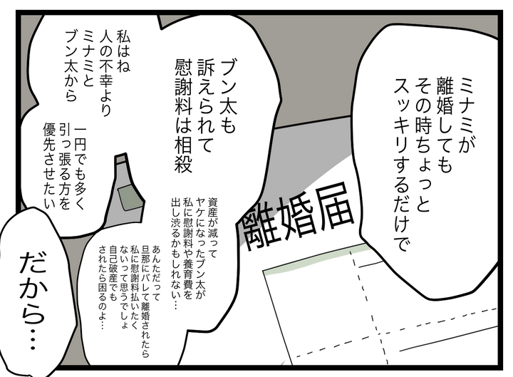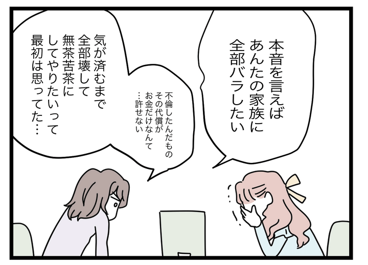 ミナミはこの期に及んでレコーダーを奪えばどうにかなると思っていたようですが、彼女に残された道は示談に応じて慰謝料を払うか、裁判になって家族にバレるか、この2択しかないのです。