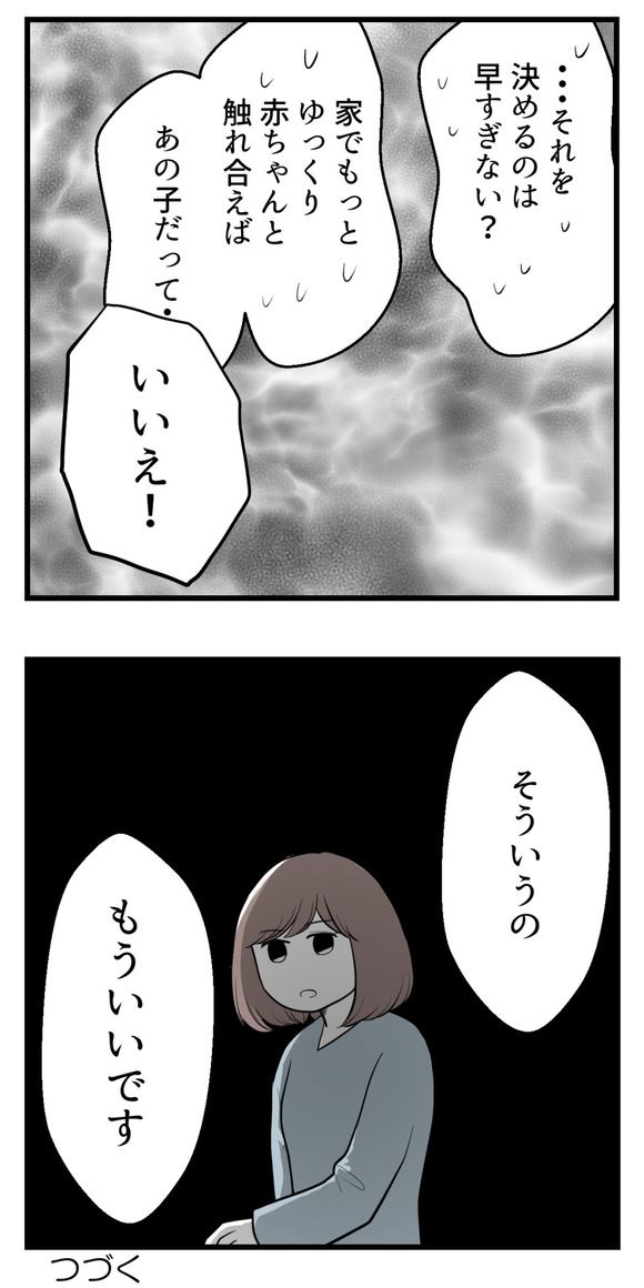 自分の母がヨウスケを一喝してくれたけど変化がなかったこと、義母も説得してくれると言ったけど効果がなく、自分もこれまで赤ちゃんが生まれたら変わるかもと信じることでやってきたけれど無理だったこと…。