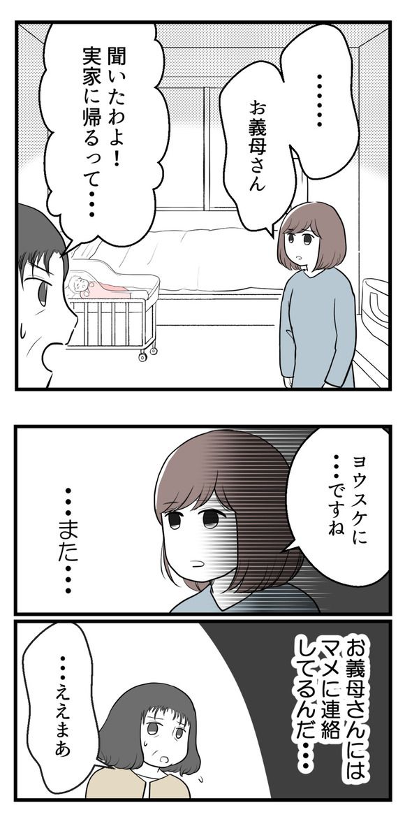 退院の準備をしていたユウを訪ねてきたのは義母。どうやらヨウスケから、ユウと赤ちゃんが実家に行くことを聞いたようです。