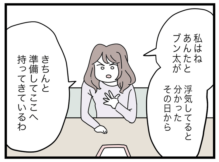 妊娠をきっかけに結婚した主人公・マチ子とブン太。生活における負担をすべて半分ずつにしたいというブン太の提示したルールは、つわりで苦しむマチ子を追いつめ、幸せな生活は一変しました。しかし、娘が生まれてからはブン太が育児に協力的になり、マチ子は離婚を思いとどまります。その後、ブン太が元同僚のミナミと裏切りの関係にあることが発覚し、マチ子は迷うことなく離婚を決意します。離婚に向けて万全の準備を進めたのち、ミナミを呼び出したマチ子は、SNSに映り込むブン太の姿を見せて問い詰めますが、ミナミは否認します。「家族に話す」と追い詰めると、観念したのかミナミはブン太との関係を認めました。しかし、バレてもなぜか余裕ぶるミナミは、「隙を見せるマチ子が悪い」と開き直り、「慰謝料を請求したとしてもお互い様だから相殺だ」と強気な発言をするのでした。