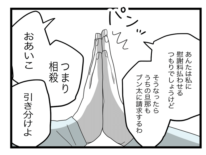 さらに慰謝料を請求したとしても、ミナミの夫もブン太に請求するからお互い様だと強気な態度。ここまで計算した上でミナミはブン太と関係を持っていたのかもしれませんね。