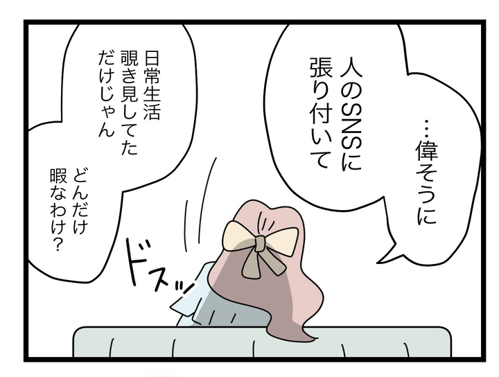 主人公・マチ子は、妊娠を機に結婚します。夫・ブン太は、生活費も家事もきっちり「半分」にしたい「半分夫」で、つわりで思うように動けないマチ子をどんどん追い詰めていきます。離婚を考えていたマチ子ですが、出産後にブン太に変化が現れます。娘のお世話に関しては積極的で、「半分」ではなくなったことから、家族3人で暮らしていこうと考え直すようになります。しかしその矢先、ブン太に裏切り疑惑が浮上し、その相手が元同僚のミナミであることが判明します。マチ子は「半分ルール」を逆手に取り、育児をすべて自分でやると宣言し、娘からブン太を引き離します。着々と離婚に向けて準備を進め、ある日ミナミを呼び出しました。マチ子はミナミのSNSに映り込んでいるブン太の写真を示し、追及しますが、ミナミはそれをただの男友達だと反論します。逃げるように立ち去ろうとするミナミを引き止め、「ミナミの家族に話す」と伝えました。どう考えても言い逃れできない状況に、ミナミは…。