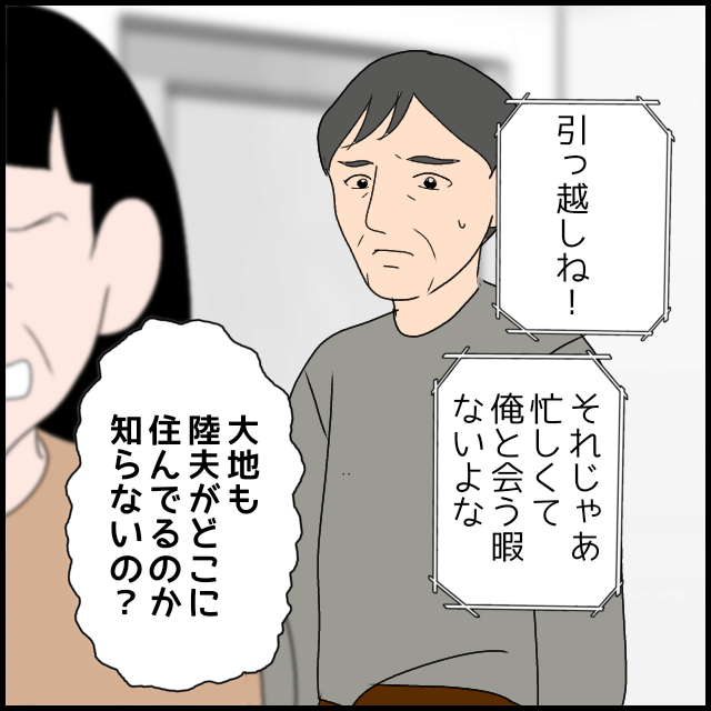 一方、陸夫(長男)の次は大地(次男)にたかろうとする義母に、義父は「そんなに贅沢したいなら自分で稼げ」と言い放つ。義父の発言にモラハラだと苛立ちながらも、「陸夫が絶縁を撤回さえすれば全てが丸く収まる」と考えた義母は陸夫の家へ。しかし、すでに空き部屋になっていて…。