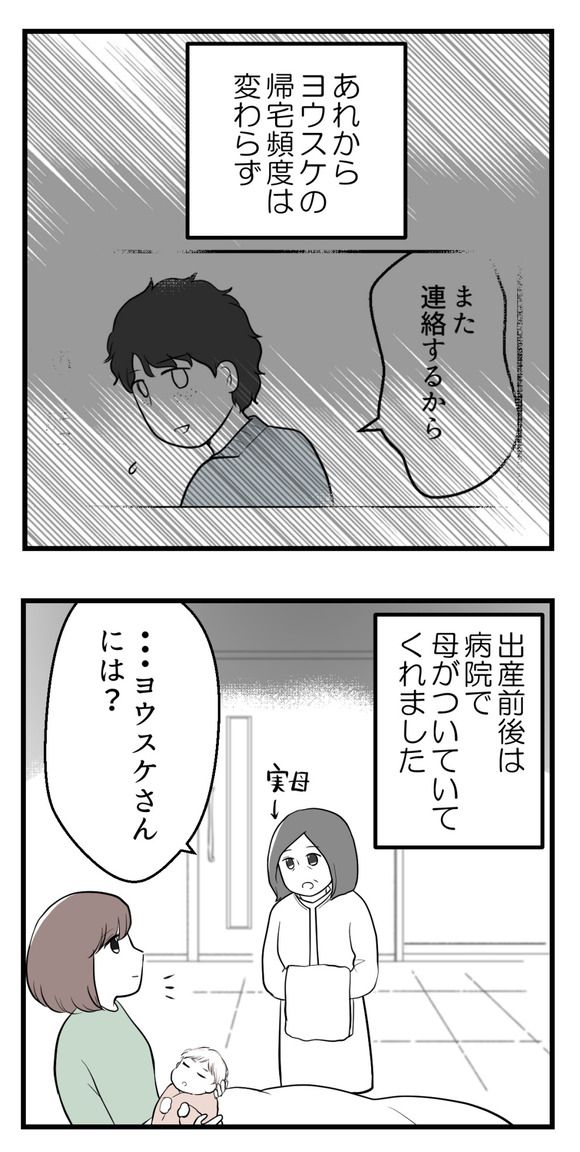 産後すぐユウがヨウスケに連絡を入れると「すぐ行く」と返信が…。ヨウスケが向かっている間、ユウと母は不安な気持ちを共有します。