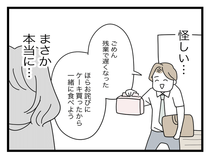 スマホは常に肌身離さず、お風呂にも持っていき脱衣所の鍵まで閉める始末。さらに残業も増え、ケーキをお土産に買ってくるなど怪しい行動が満載。