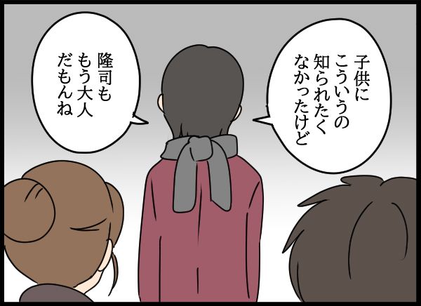 これまで気付けなかったことにやるせない思いでいっぱいになる隆司。母のことを思うと、愛華と父の関係がいつから続いていたのか、気になるのでした。