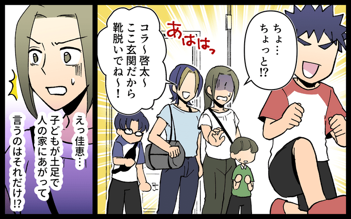 土足で上がりこむ息子に注意もしない佳恵。その後もドタバタと走り回られたので下の階に気遣うように私がやんわりお願いすると、「田舎は一軒家だから足音なんて」と佳恵は笑い飛ばしていました。