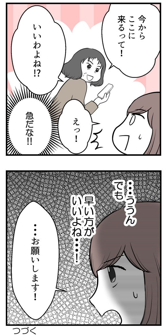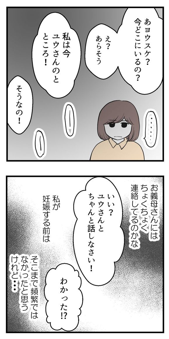 そんな中、ヨウスケから義母に電話が…。「まかせて」と電話を取った義母は、ヨウスケがこれから自宅に来るように仕向けてくれたようで…。