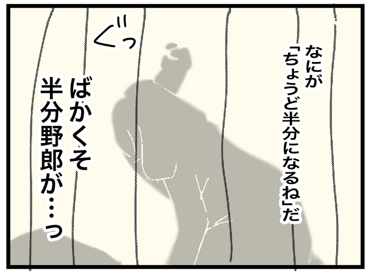 妊娠を機に結婚を決めた主人公・マチ子とブン太。ブン太は生活費と家事を完全に折半したいというこだわりが強く、マチ子のつわりが酷くなってもそのルールを強要します。職を失い、半分ルールの廃止を申し出たマチ子でしたが、ブン太は離婚か半分を守るかの二択を迫ります。赤ちゃんを守るために半分を守る選択をしたマチ子は家事の全てを担うことに。ある日、健診の帰り道に同僚のミナミに再会。マチ子を会社から追い出してすぐ妊娠が分かり、仕事も結婚生活もうまくいかないことを嘆いては、ずっとマチ子の不幸を願っていたと言うのです。そんなミナミをあしらい帰宅したマチ子でしたが、ミナミのSNSを覗くとマチ子の悪口がびっしり。何がなんでも強くなると決心したマチ子は無事に出産。我が子を抱いて愛でるブン太でしたが、マチ子には労いの言葉をかけることもなく、自分に有利な新たな半分ルールを提示したのでした。