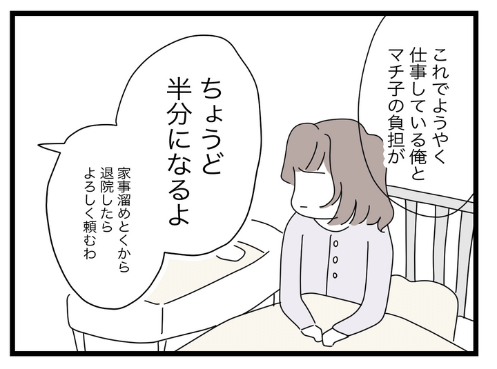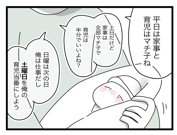 しかし出産直後のマチ子に「お疲れ様」の一言もなく、育児が追加された今後の半分ルールについて提示してきました。自分は仕事がメインだから、土曜日だけ育児をすると言うのです。