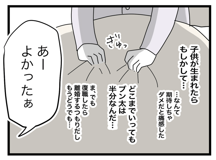 同棲中に妊娠がわかり入籍した主人公・マチ子とブン太。ブン太の「家事と生活費を半々にしたい」というこだわりは日々エスカレートし、マチ子がつわりで家事ができなくなると執拗に責めるようになりました。ついには無職となったマチ子が半分ルールをやめたいとブン太に相談すると、離婚を切り出してきて…。赤ちゃんのために我慢することを選んだマチ子は家事をすべて担当することになりました。ある日、産科の前で偶然再会したのは同僚のミナミ。マチ子を退職に追い込んだ後、すぐにミナミも妊娠しました。思い通りにいかないストレスをマチ子にぶつけるミナミに「一生許さない」とだけ伝えて立ち去りました。帰宅後、ふとミナミのSNSを見てみると、マチ子に対する悪口がたくさん書き込まれており、胸が引き裂かれそうになります。早く自立しないと本当にダメになる…そう思ったマチ子は「絶対に離婚する」と決意し、出産に挑んだのでした。