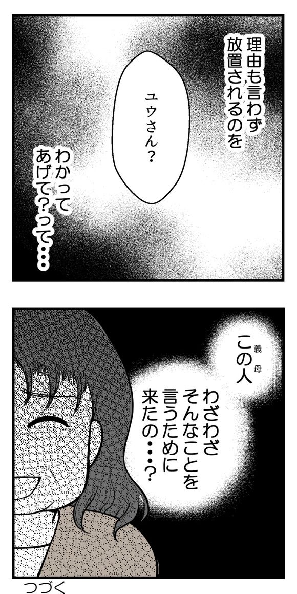 「男の子がオススメ」だと言う義母にあきれたユウは、義母が今日何をしに来たのか問います。