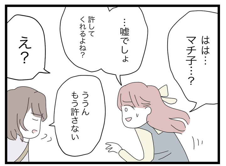同棲中のブン太との間に子どもを授かり、籍を入れた主人公・マチ子。しかし、家事も生活費もきっちり折半にしたいというブン太の執念が、つわり中のマチ子を苦しめます。無職になり、半分ルールをやめたいと話すと、ブン太は離婚か半分生活を続けるかの二択を迫ります。赤ちゃんのために我慢することにしたマチ子は、家事をすべて担うことになりますが、ブン太はクレーマーのように執拗に粗探しをするように。ブン太への愛が完全に冷めたある日、産科の前でマチ子を会社から追い出した張本人・ミナミに遭遇します。マチ子が休職した矢先に妊娠が発覚したミナミは、冷たい態度をとるマチ子に苛立ち、「ずっと不幸になればいいのにと思っていた。つわりが終わらないのは恵まれているからだ」と罵ります。その後、「悪態をついたのはホルモンバランスが崩れているせいだから許して欲しい」と言い出すミナミ。人を見下すようなその笑顔がブン太と重なり、マチ子は「一生許さない」と言い切りました。