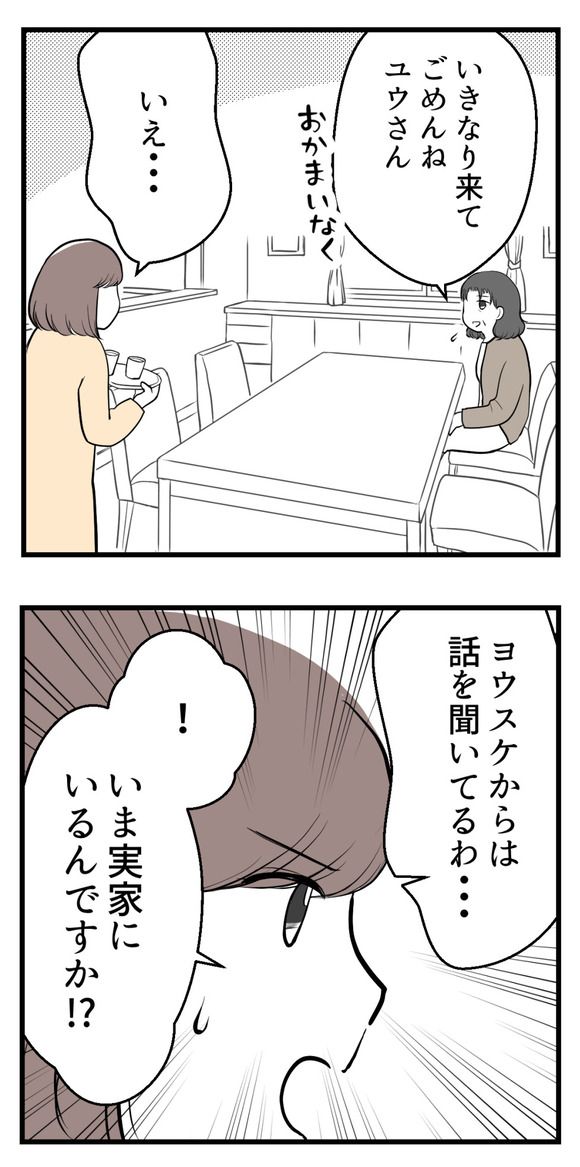 「話は聞いてるわ」という義母に、思わずユウはヨウスケが今、実家にいるのかと思ってしまいます。