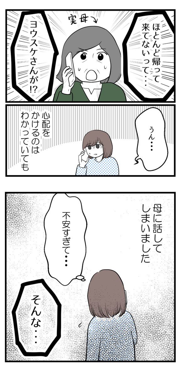 実母に話したことで少し安心するものの、妊娠中の急激に体が変化する時期にひとりにされて、ユウの不安な気持ちは消えないのでした。