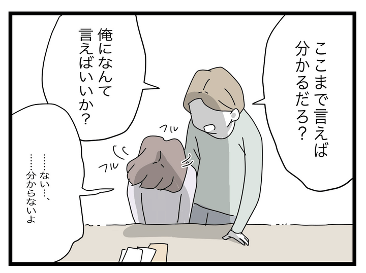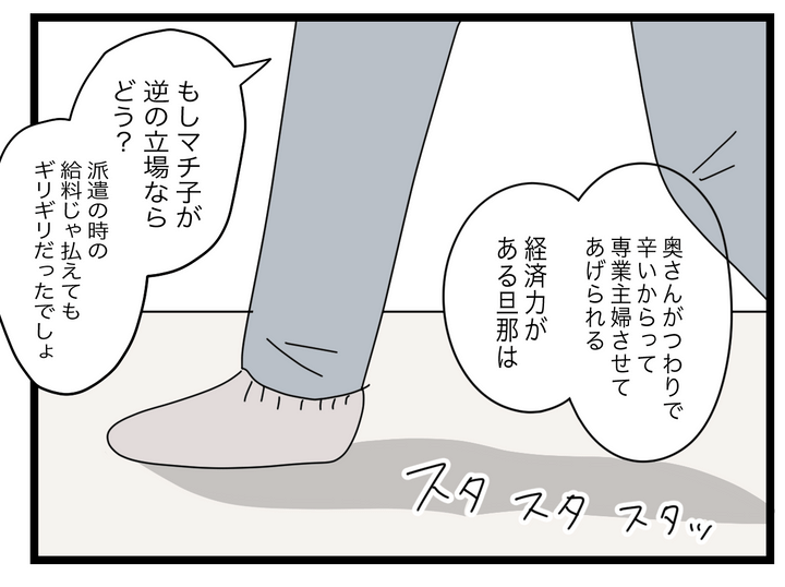 同棲中に妊娠し結婚することになった主人公・マチ子とブン太。家事と生活費は半分ずつというルールにこだわるブン太はつわりでできない家事が増えていくマチ子に文句を言うように。つわりが原因で休職中だったマチ子は契約を切られてしまい、ブン太に生活費が払えないこと、半分ルールはもう限界だと打ち明けました。そんなマチ子に初めから寄生するつもりで結婚したのかと罵り、半分が守れないなら即離婚だと切り出したブン太。妊婦を平気で追い出そうとする冷酷なブン太に恐怖を覚えたマチ子でしたが、出産して落ち着くまでの辛抱だと自分に言い聞かせ、離婚を諦めます。生活費はブン太、家事はマチ子という新たな半分ルールが始まり、生活費を差し出したブン太に妊婦健診などの細かい出費があるため、これでは足りないと伝えたマチ子。するとブン太は「マチ子代」として3万円叩きつけ、お礼の他に言うことないの?と詰め寄るのでした。