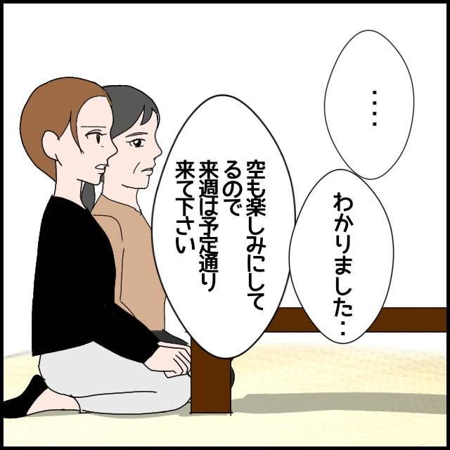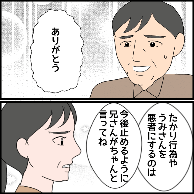 しかし1年後、あっさりと義母を許してしまう夫。そして、同じく義母にたかられた経験がある義叔母の協力によって、義父が“うみを悪者扱いする義母”を信じ切っていたことが判明する。うみが真実を告げると、義父は謝罪。実は、自身が海外赴任する際に無理をいって付いてきてもらったこと、さらには投資詐欺にあった過去があり、義母に頭が上がらないという。それでも、「家に帰ったらちゃんと話をする」といい…。