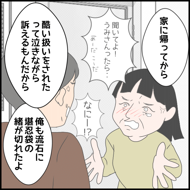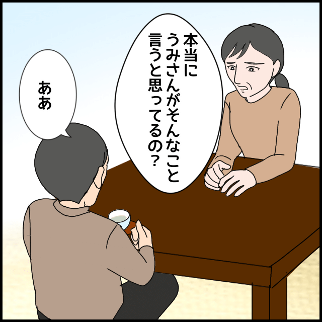 しかし1年後、義母が子どもの誕生日会に参加したいと言い出す。そこでうみは「お祝いの日の料理代は個々で支払うように」と忠告。すると翌日、「うみの態度が悪い」という理由で、誕生日会のキャンセルの連絡が来る。心の糸が切れたうみは、同じく義母にたかられた経験がある義叔母に相談。その後、義叔母が兄である義父に直接話をしてくれたのだが、義父は完全に義母の味方なようで…。