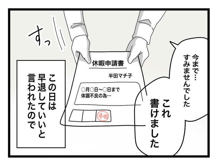 しかしマチ子の有給日数ではつわりが終わる前に使い切ってしまうので、欠勤扱いは避けたいと考え産婦人科に向かいました。