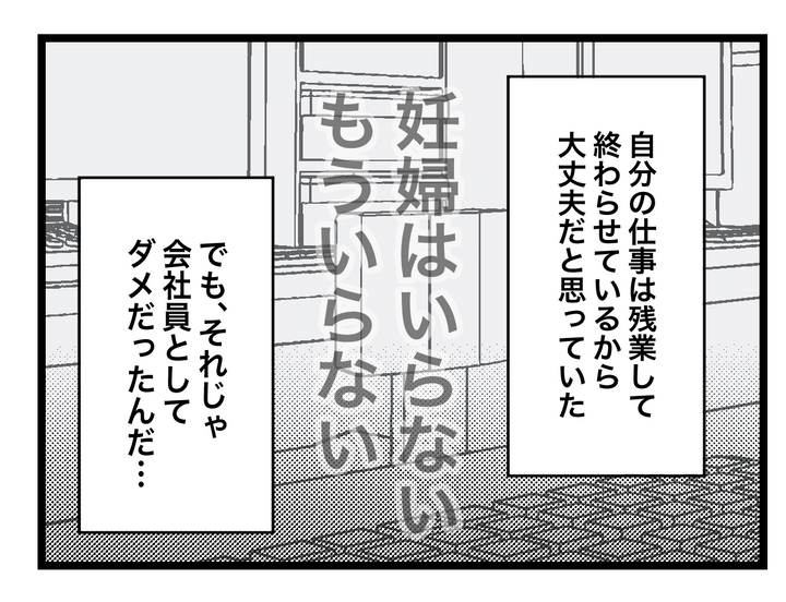 妊娠をきっかけに結婚することになった主人公・マチ子とブン太。同棲中から設けられていた「家事と生活費をきっちり半分」というルールは、マチ子がつわりで苦しみ始めてからも変わることなく、ブン太から強要されていたマチ子。つわりが原因で家事ができないことをブン太から責められ、家にも会社にも居場所がないと感じるようになります。先日の会社での出来事…、マチ子は上司から頼まれた仕事が追い付かず、同僚・ミナミから急かされるほどに吐き気が酷くなりトイレへ。追いかけてきたミナミに「サボるならつわりが終わるまで会社に来るな」と言われ、部署の皆も同じ思いだと告げられます。ちゃんと仕事ができる人が会社に来るべきなのに、それで会社員って言えるの?と問われるのでした。