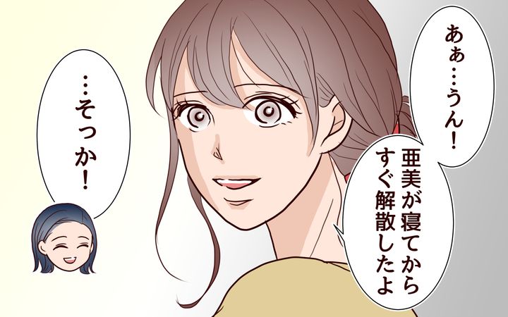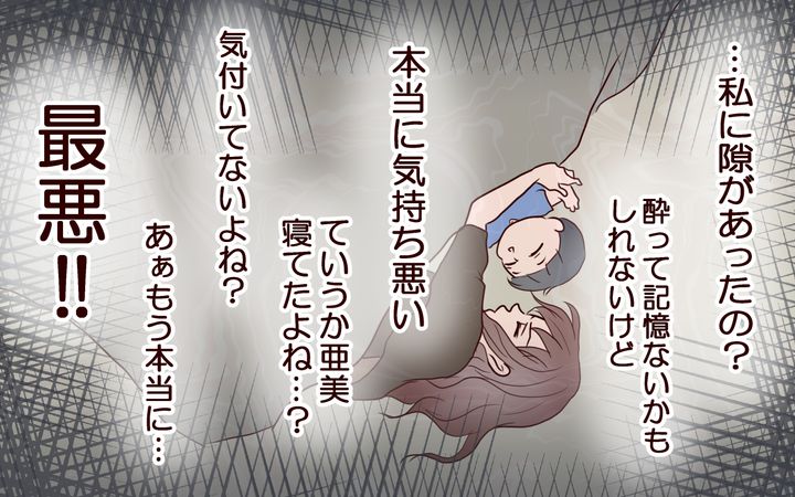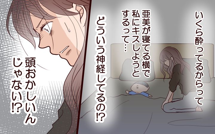 両家で優子の義実家の別荘に旅行に行った夜、子どもを寝かしつけたあとで3人で飲んでいると、亜美が寝てしまう。