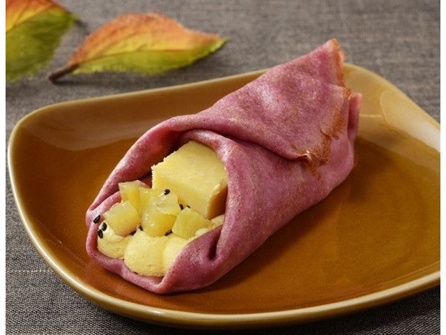 スイートポテト生地とホイップカスタード、カラメルチップを包んだおいも味のクレープ。