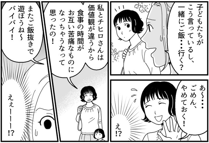 私はチヒロ。娘のシズカ(5歳)を育てています。今日は習い事で一緒のカスミさん・マオちゃん(5歳)親子とファミレスに行きました。しかしマオちゃんがお子様ランチを半分も残しているのに、カスミさんは平然と「ごちそうさま」をさせました。私にとっては許されないこと。シズカが驚いて「悪い子だよね?」と言ったので、私ははっきり「うん、残したら悪い子だよ」と伝えたのでした。カスミさんは私が最も軽蔑する、ご飯を平気で残すタイプの人だったのです。