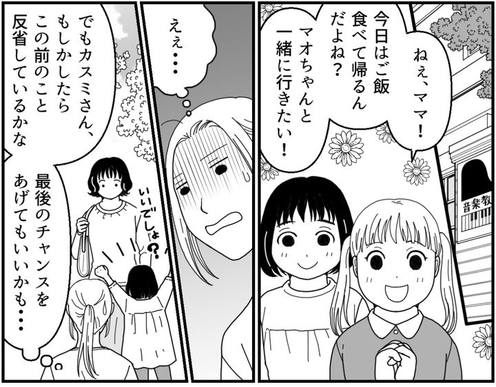 その日は夫の帰宅が遅いので、シズカとどこかで外食をして帰ろうという話をしていました。するとマオちゃんの家も同じだったようです。子ども同士が意気投合しているから、もしカスミさんが反省して行動をあらためるなら、これまでどおりの付き合いを続けてあげてもいいかもしれない……。そう思って私はチャンスをあげるつもりで誘ったのです。
