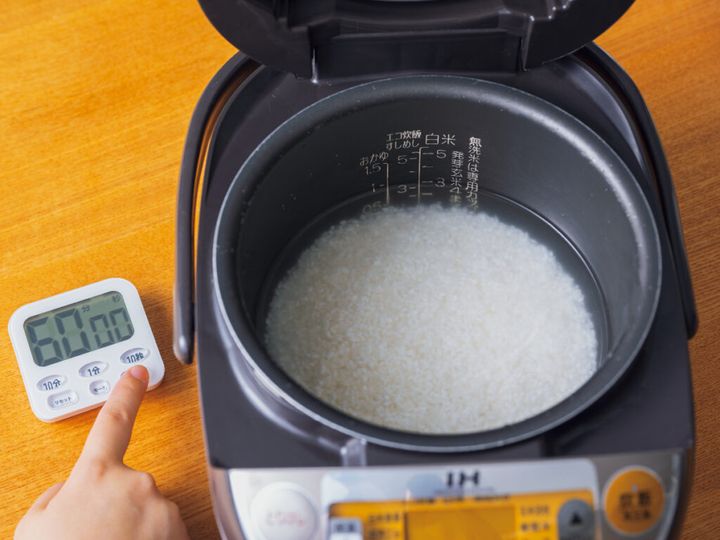 昨今の炊飯器は、炊飯前後の浸水や蒸らしの時間も含めてプログラムされていることがほとんど。取扱説明書をよく確認してみて。無洗米モードや古米モードがあれば、上手に利用しましょう。